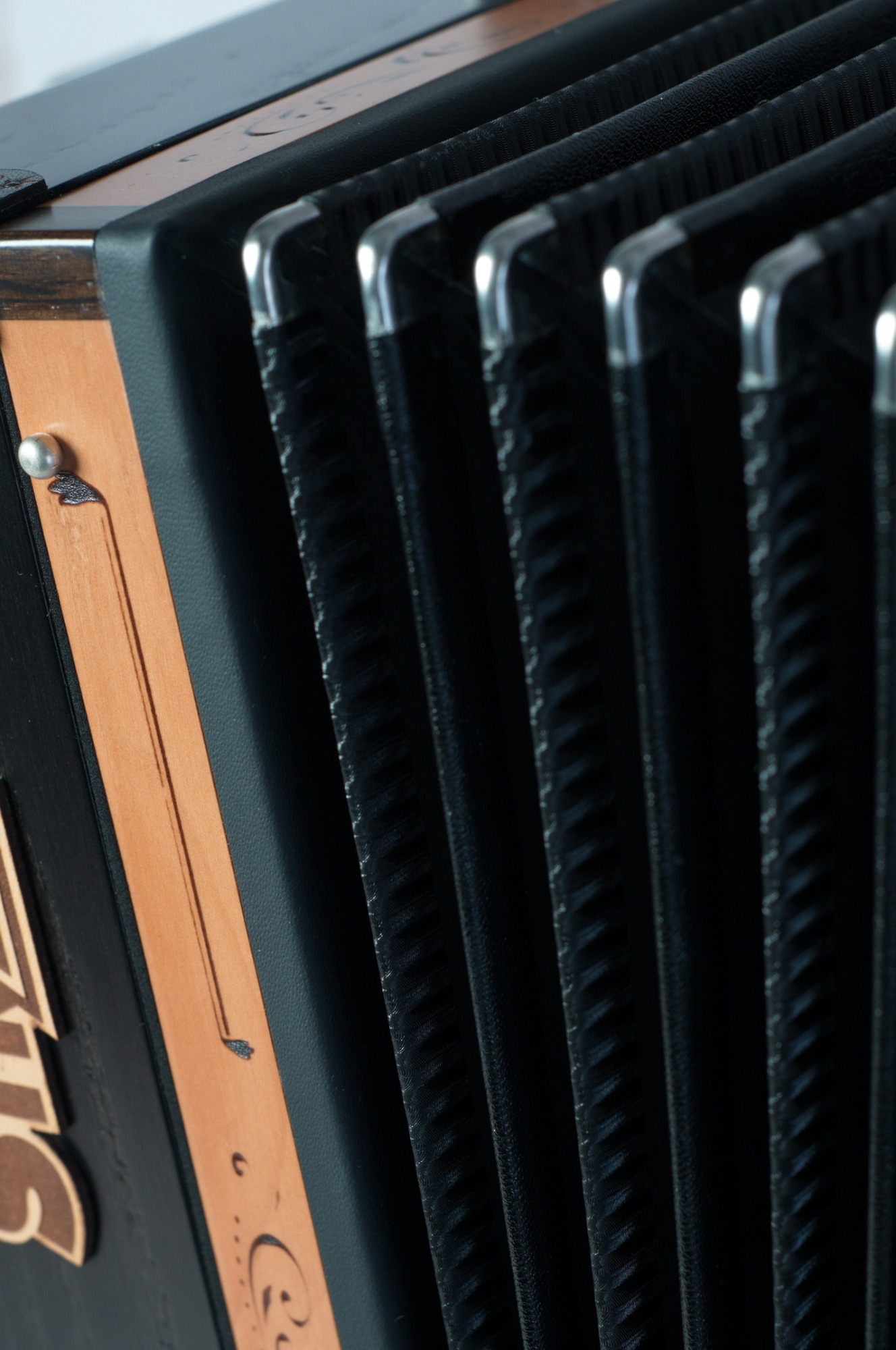 Diese handgefertigte Steirische Harmonika vereint Tradition und Moderne. Das massive Zypressenholz verleiht ihr nicht nur ein edles Aussehen, sondern sorgt auch für einen warmen und ausdrucksstarken Klang.